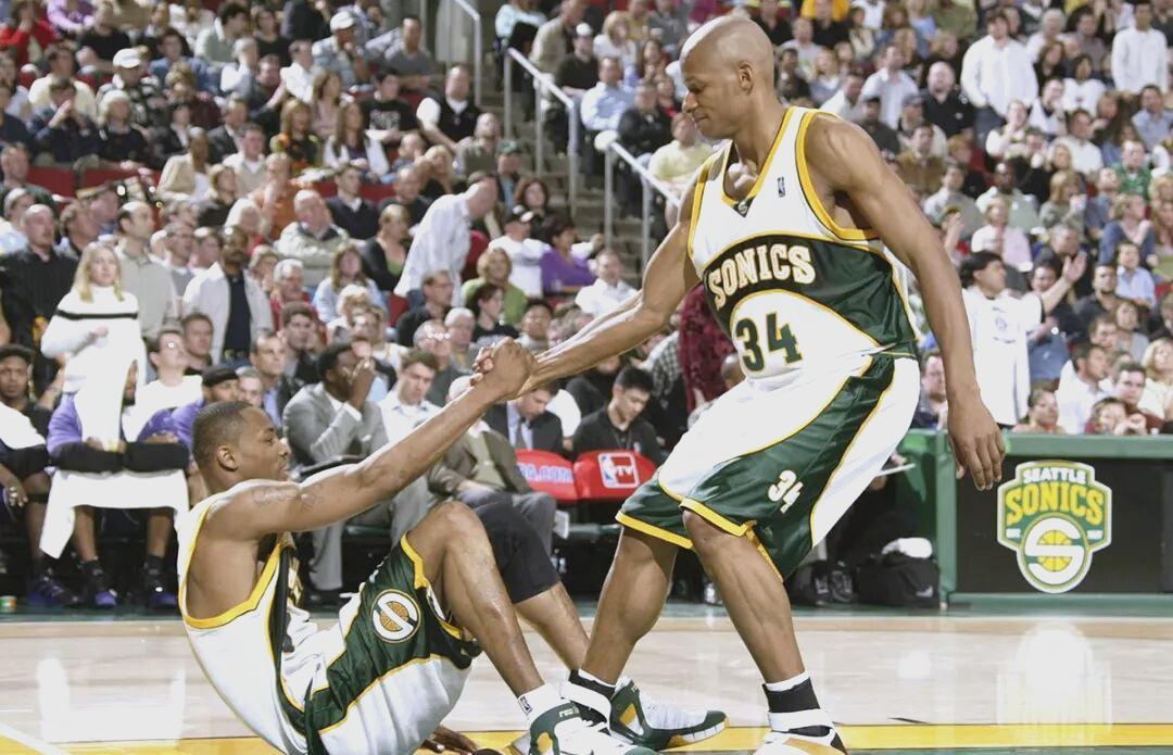 首先,我们先来说说入选了最佳第二阵容的得分后卫,他就是和科比同一年进入NBA的雷·阿伦了。可能很多球迷对于雷·阿伦的印象,停留在了凯尔特人时期的三巨头,或者是生涯暮年加盟热火队,在2013年总决赛的第六场,命中绝平三分的经典时刻。但年轻时的雷·阿伦,也是雄霸NBA一方的核心球员。